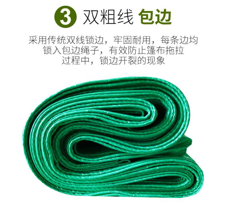 雙綠色PE防水篷布雙粗線包邊,采用傳統(tǒng)雙線鎖邊,牢固耐用,每條邊均鎖入包邊繩子,有效防止篷布拖拉過程中,鎖邊開裂的現(xiàn)象